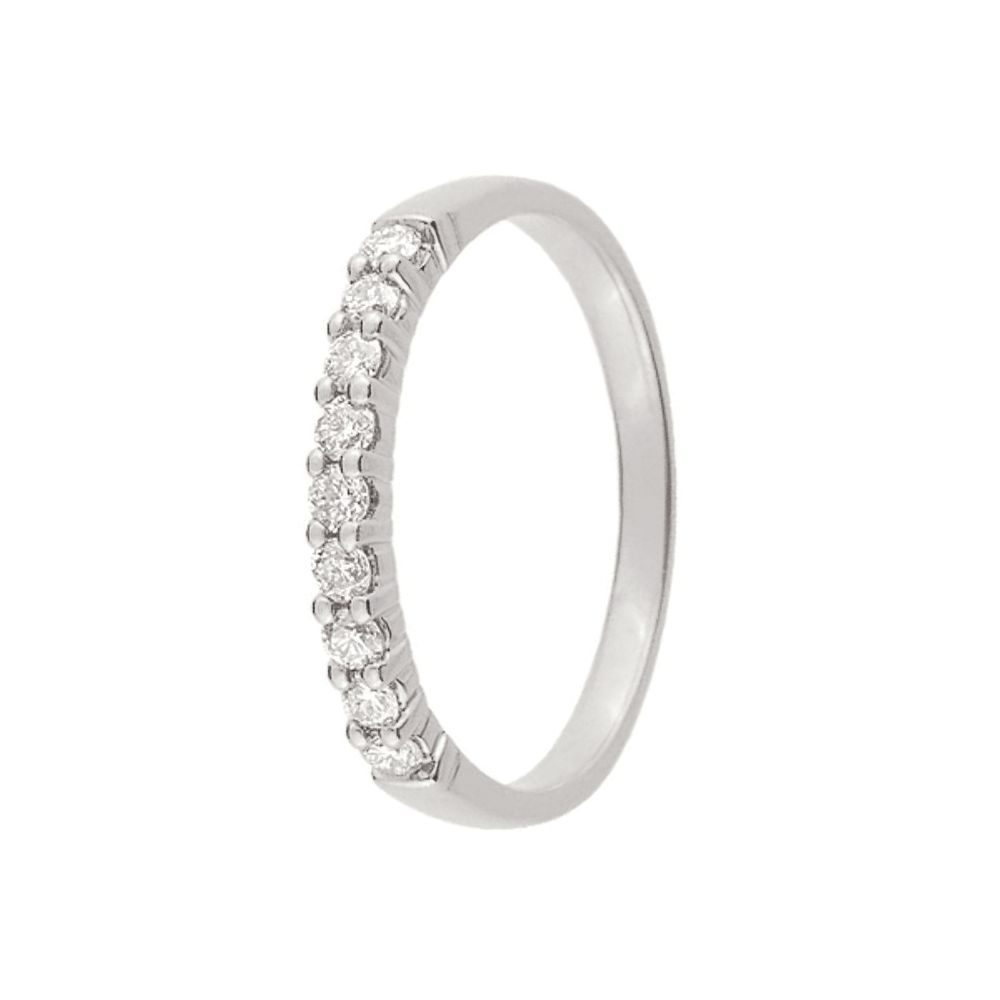 Alliance de mariage en Or blanc 750‰ (18 carats) serti griffe avec 9 Diamants qualité HSI pour un total de 0.25 carat. Cette alliance de mariage avec décor sur les griffes mesure environ 2.1 mm de largeur.