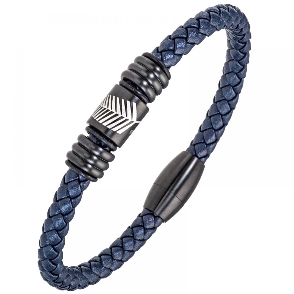 Bracelet homme All Blacks en cuir bleu foncé et acier inoxydable. Longueur 20 cm. Élégant, moderne et distinctif.