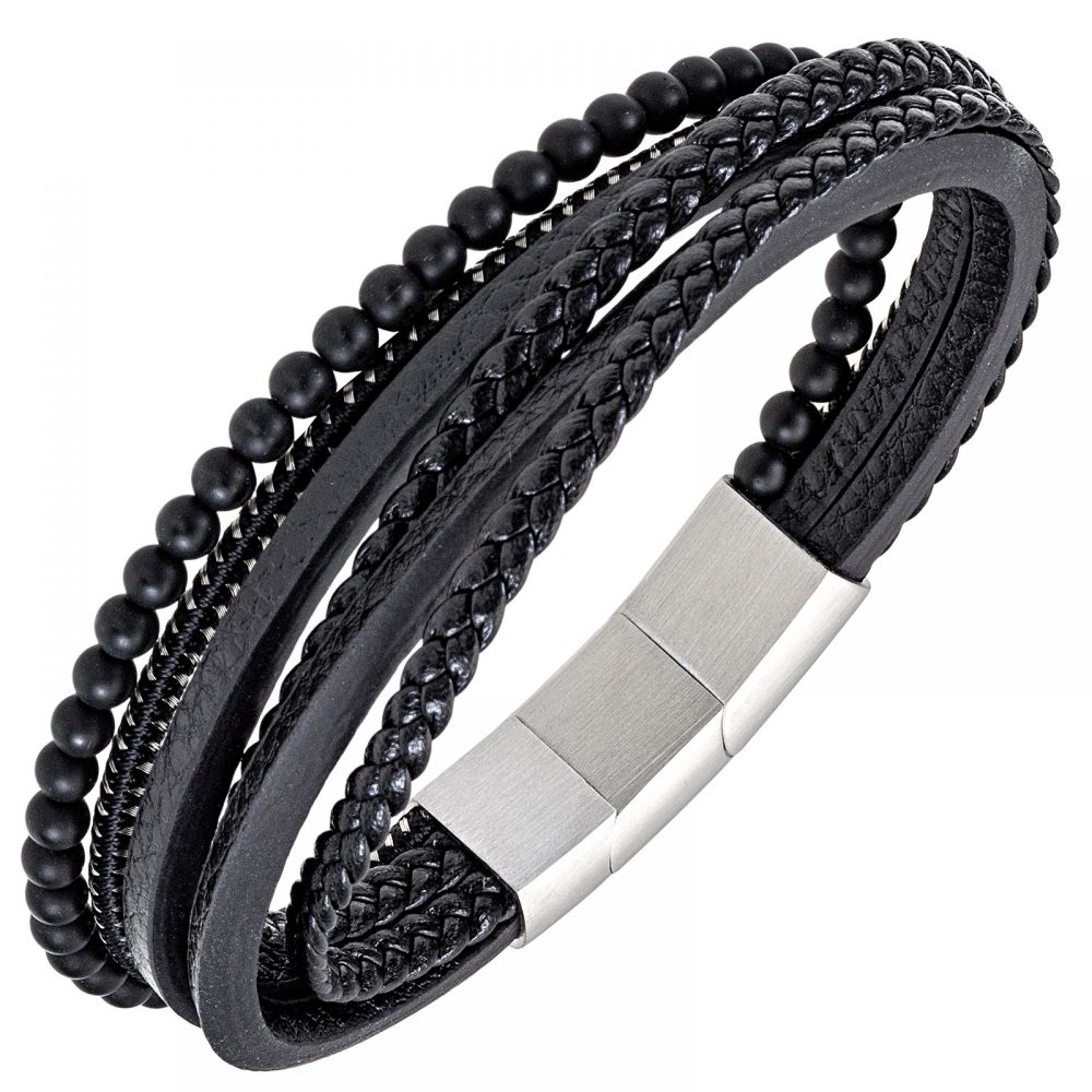 Bracelet homme All Blacks en cuir noir avec perles d’agate 4 mm et finitions acier. Taille ajustable 18,5-19,5 cm. Élégant et minéral.