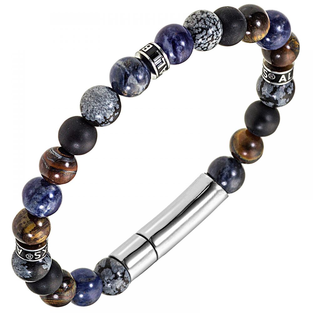 Bracelet homme All Blacks en perles acier marron & bleu avec Œil de tigre, Agate noir et Pierre de veine bleu. Longueur 18,5 cm. Élégant et minéral.