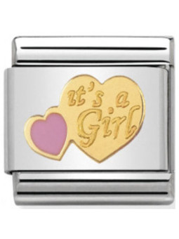 Maillon de bracelet Nomination classic représentant un coeur en Or jaune avec l'inscription gravée it's a Girl traduction de "c'est une fille et un petit coeur rose en émail. Votre commande de maillon(s) Nomination vous sera livrée dans son écrin Nomination accompagnée de son certificat d'authenticité et d'un catalogue Nomination.