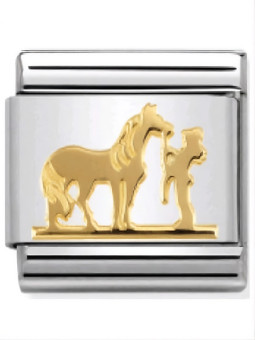 Maillon de bracelet Nomination classic cheval et jockey en Or jaune 750 sur une base en Acier Inoxydable. Votre commande de maillon(s) Nomination vous sera livrée dans son écrin Nomination accompagnée de son certificat d'authenticité et d'un catalogue Nomination.