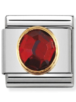 Maillon Nomination classic, original avec sa pierre rouge ronde, à facettes, en oxyde de zirconium et contour en Or jaune, avec un rendu très chaleureux et optimiste.
