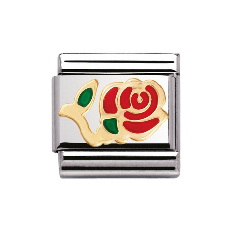 Maillon de bracelet Nomination classic, rose en Or et email rouge et verte. Votre commande de maillon(s) Nomination vous sera livrée dans son écrin Nomination accompagnée de son certificat d'authenticité et d'un catalogue Nomination.