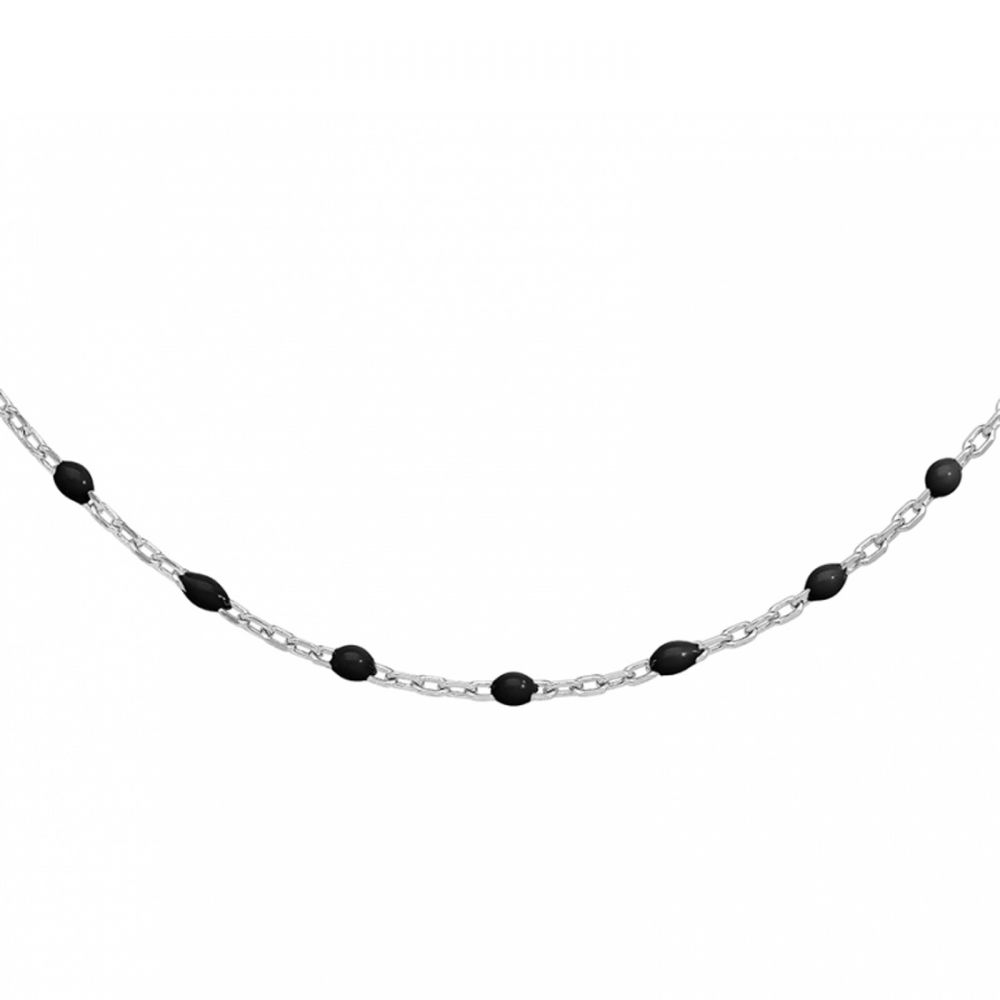 Sobriété et élégance pour ce collier en argent rhodié, décoré de petites olives en résine noire. Un bijou polyvalent et raffiné pour toutes les occasions.