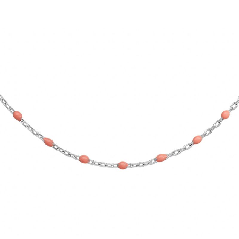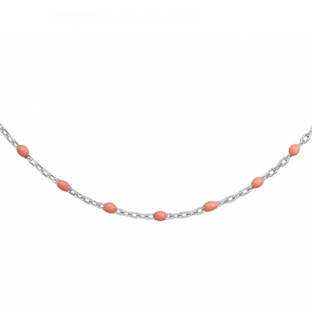 Collier chaîne argent rhodié décoré d’olives en résine rose. Longueur 40+5 cm (45 cm), poids 2,70 g. Raffiné et féminin.