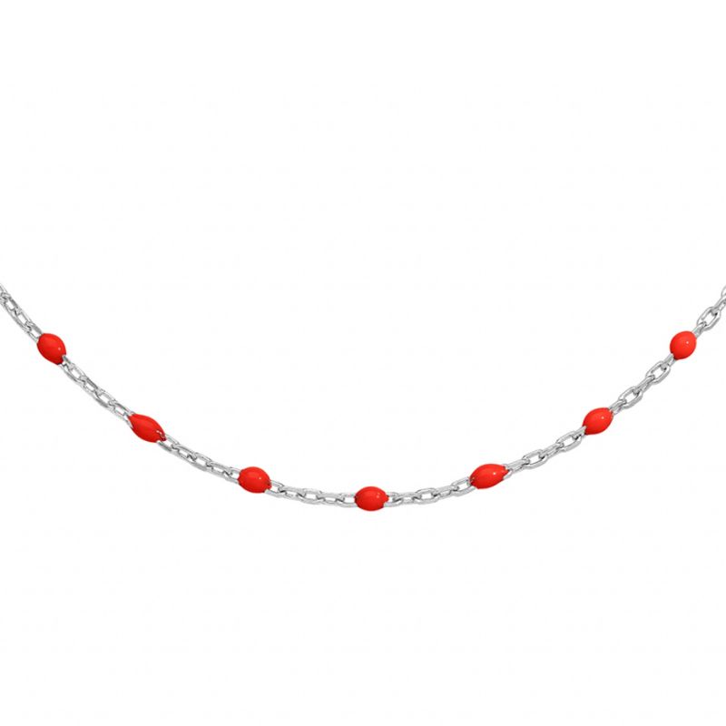 Vif et élégant, ce collier en argent rhodié est décoré de petites olives en résine rouge. Bijou moderne et audacieux qui attire le regard.