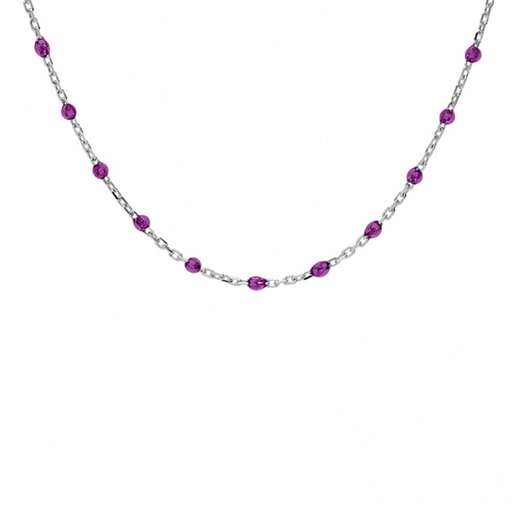 Délicat et moderne, ce collier en argent rhodié est orné de petites olives en résine violet transparent. Sa couleur lumineuse et originale apporte élégance et style.