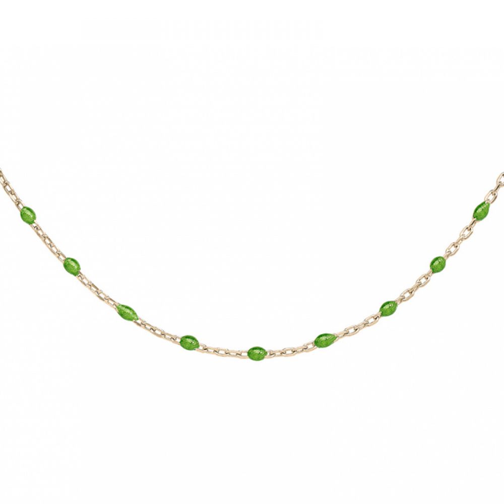 Collier chaîne argent doré décoré d’olives en résine verte. Longueur 40+5 cm (45 cm), poids 2,70 g. Chic et coloré.
