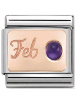 Maillon Nomination classic mois de Février et Améthyste en Or rose 9 carats avec l'inscription "Feb" pour Février. Une Améthyste est serti sur le côté désignant la pierre correspondant au mois de naissance. Votre commande de maillons Nomination vous sera livrée dans son écrin Nomination accompagnée de son certificat d'authenticité et d'un catalogue Nomination.