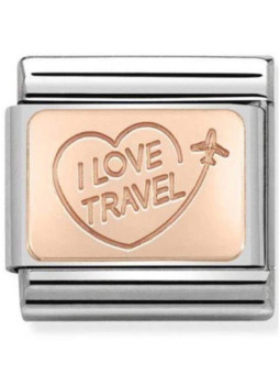 Maillon de bracelet Nomination classic avec la mention I love Travel (traduction de J'aime voyager) avec un coeur et un avion en Or rose 9 carats sur une base en acier inoxydable. Votre commande de maillon(s) Nomination vous sera livrée dans son écrin Nomination accompagnée de son certificat d'authenticité et d'un catalogue Nomination.