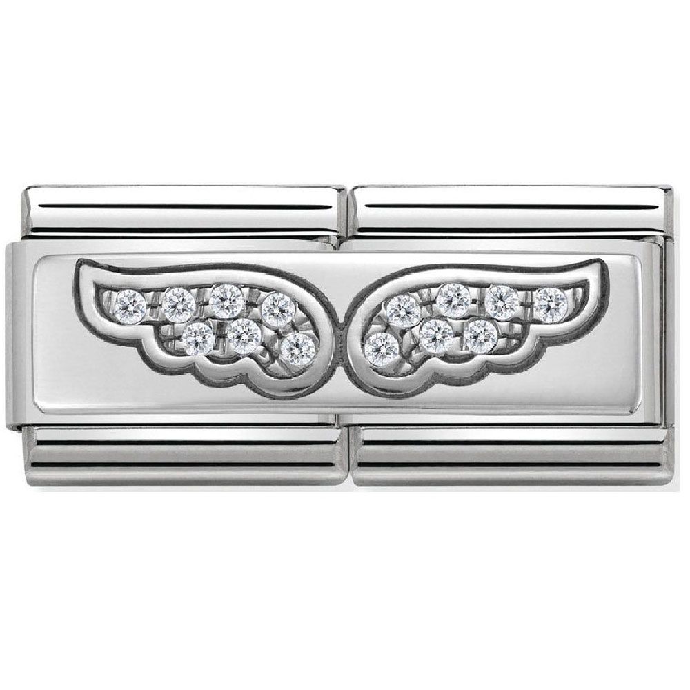 Maillon de bracelet Nomination classic double Plaque ailes en Argent avec oxydes de zirconiums blancs, sur une base en Acier. Votre commande de maillon(s) Nomination vous sera livrée dans son écrin Nomination accompagnée de son certificat d'authenticité et d'un catalogue Nomination.