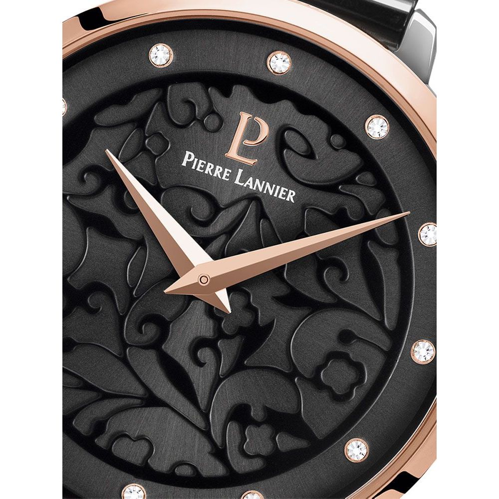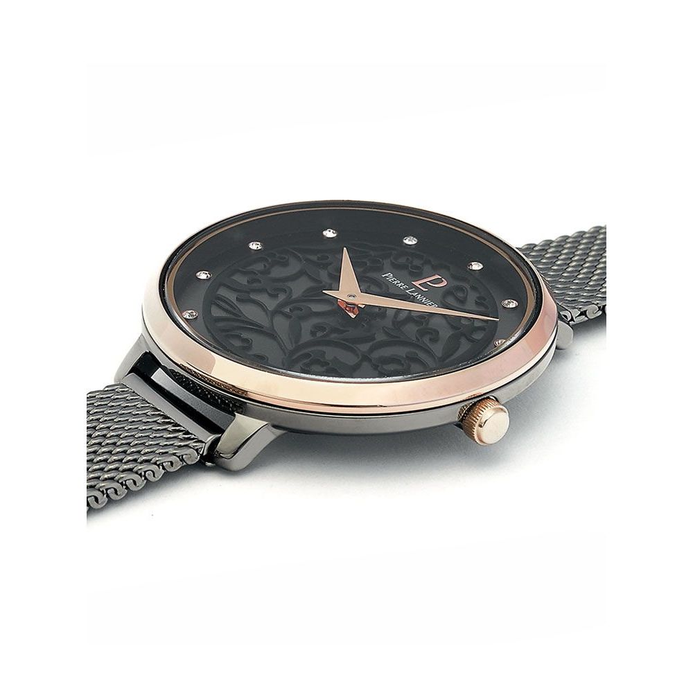 La montre EOLIA 045L988 allie élégance et finesse avec son boîtier rond en acier gris de 33 mm, associé à une lunette doré-rose raffinée. Son cadran gris soleillé est décoré d?un motif floral délicat, mis en valeur par des aiguilles doré-rose.