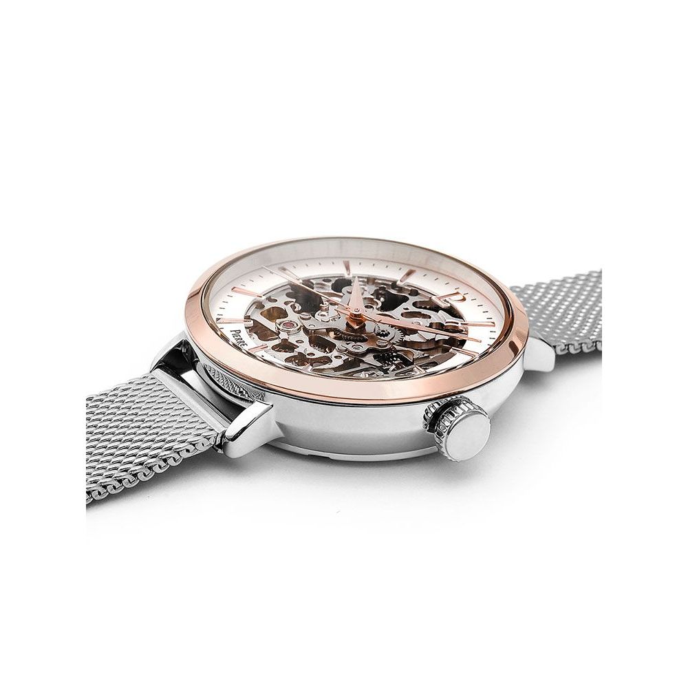 Le bracelet milanais en acier argenté de 14 mm, avec boucle coulissante sécurisée, assure confort et style au poignet. Dotée d?un mouvement automatique à 3 aiguilles et d?une étanchéité de 30M, cette montre combine élégance et praticité.