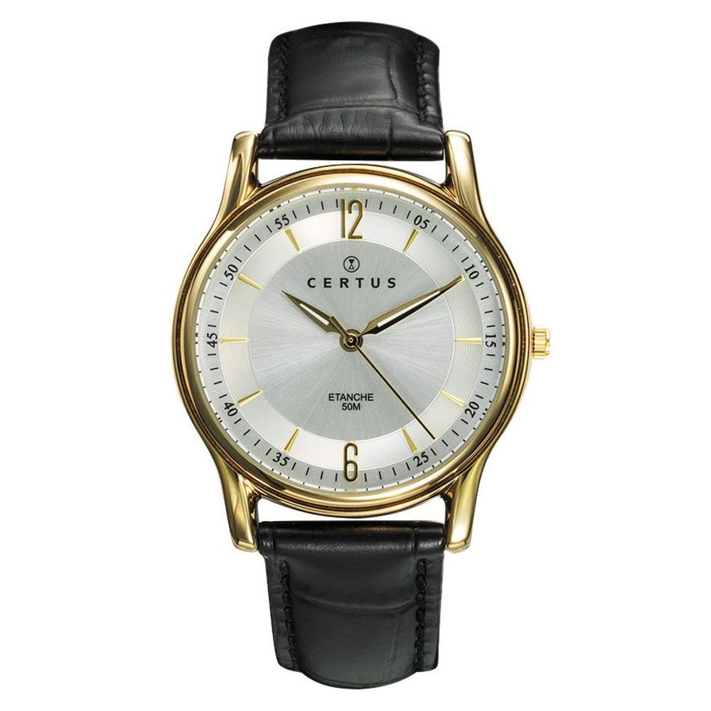 Montre homme Certus vintage, boîtier acier doré 35 mm, bracelet cuir noir, verre minéral, étanche 5 ATM.
