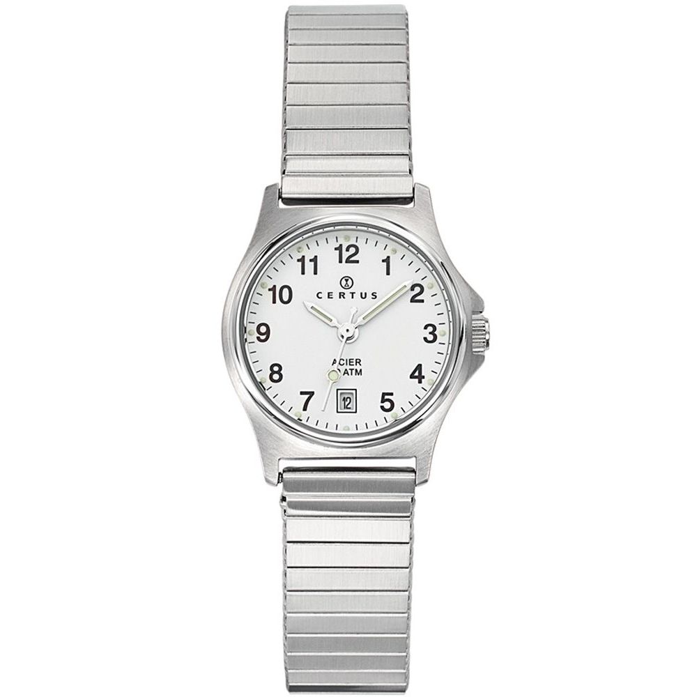 Montre femme Certus 625020 au style classique avec cadran blanc, chiffres noirs, bracelet extensible chromé et étanchéité 10 ATM.