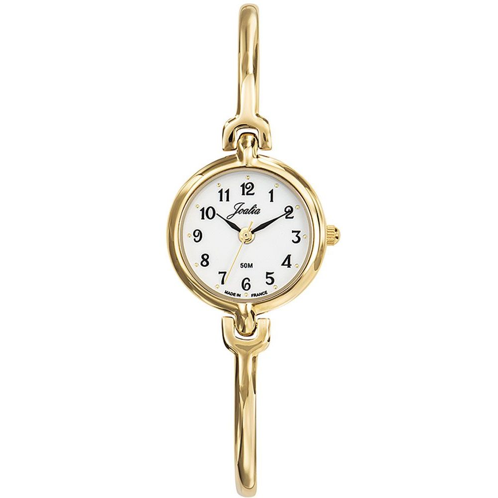 Montre femme Joalia 630503 ? boîtier rond doré 22 mm, bracelet fin, cadran blanc, chiffres noirs, mouvement quartz, étanche 3 ATM.