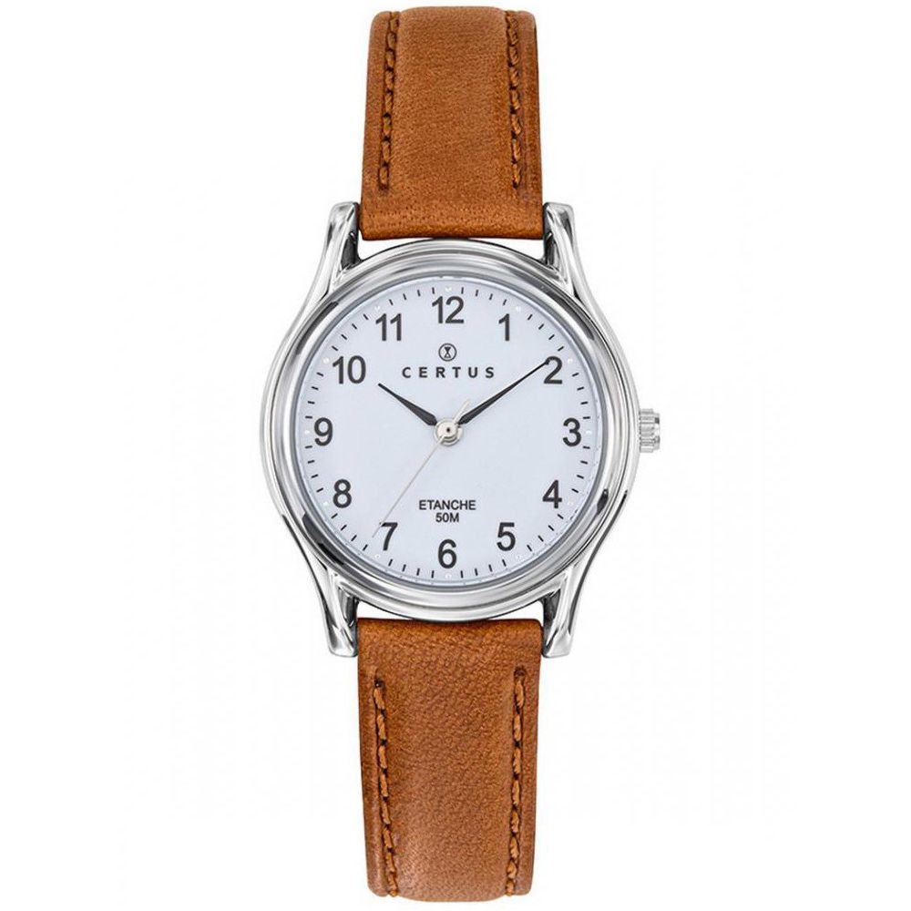 Montre femme Certus 644285 avec boîtier argenté, cadran blanc à chiffres noirs, bracelet cuir marron et étanchéité 5 ATM.