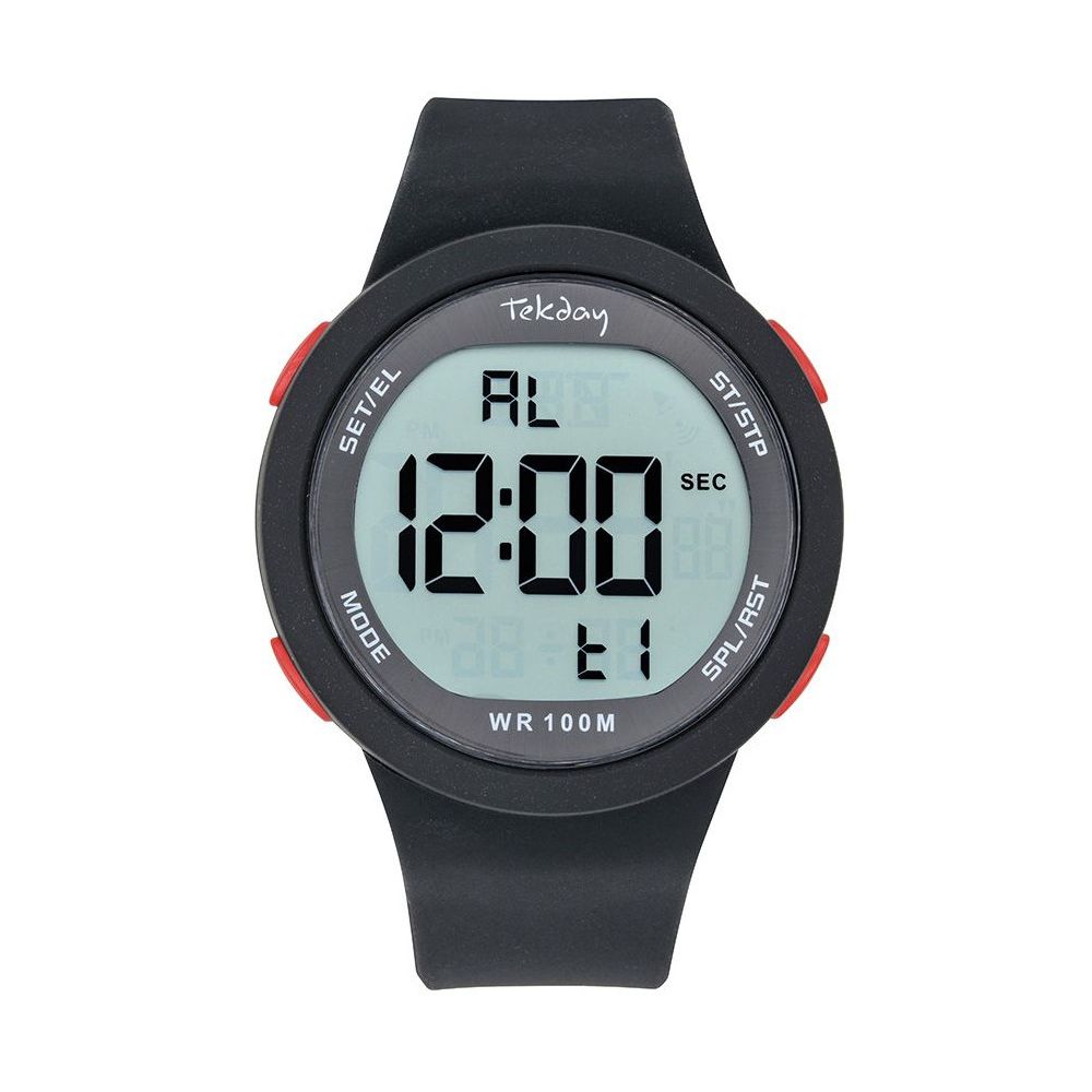 Montre homme TEKDAY noire digitale, étanche 10 ATM, bracelet plastique, boîtier rond 45 mm avec boucle chromée et verre minéral.