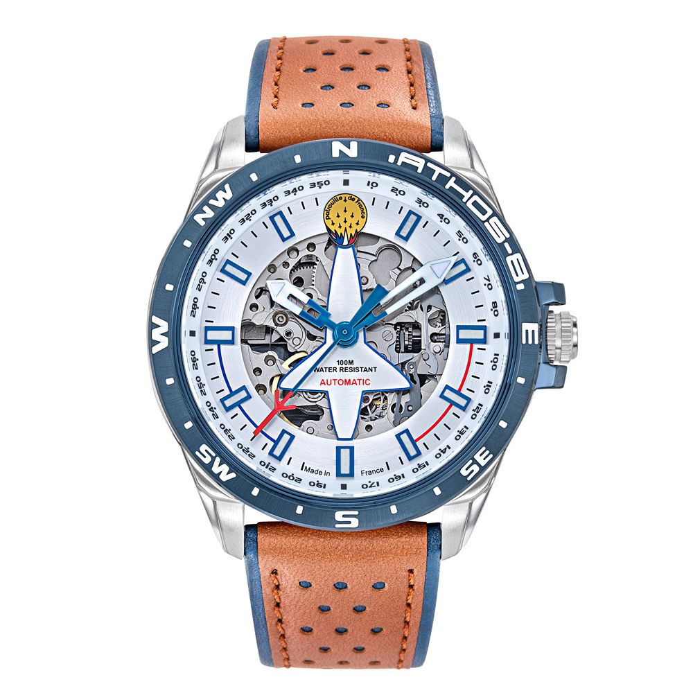 Montre homme Patrouille de France 668130 ? Automatique, boîtier acier 44 mm, cadran argenté, index bâtons bleus lumineux, bracelet cuir marron & bleu, étanche 10 ATM.